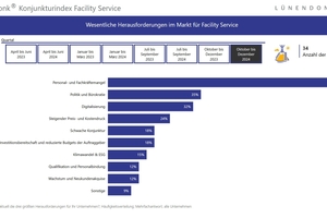 Im ersten Quartal 2025 erwarten die Facility-Service-Anbieter ein Umsatzwachstum von 6,1 % und eine Personalentwicklung von plus 5,2 %. Für das gesamte Geschäftsjahr 2025 prognostizieren die Dienstleister ein Umsatzplus von 7,2 %. Das wichtigste Thema für das Geschäftsjahr 2025 ist für 46 % der Facility-Service-Unternehmen die Digitalisierung und Optimierung von Prozessen und Leistungen. 23 % der Unternehmen planen KI-Tools in ihren Betrieb zu integrieren. Damit nimmt die Bedeutung technologischer Innovationen im Markt weiter zu.