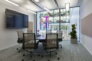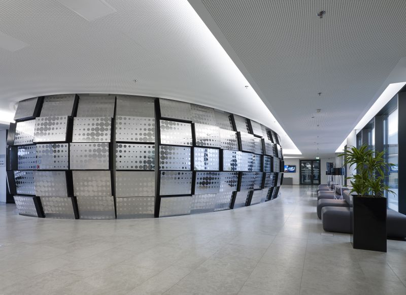 Innerhalb der zentralen viergeschossigen Eingangshalle bietet die Cafeteria Digital Eatery – neben den eigenen Mitarbeitern – auch Besuchern und Gästen einen Mix aus Café und Showroom. Wer mehr als einen Snack zu sich nehmen möchte, findet schnell den Weg in die Kantine mit 400 Plätzen. Die Ausgabebereiche sind als Marktplatz konzipiert, weshalb die drei Counter locker und farblich akzentuiert zwischen den Sitzbereichen angeordnet sind. Ebenfalls im Erdgeschoss befinden sich anmietbare Konferenzräume mit modernster Medientechnik, ein großer Saal für 150 Personen und vier Multi-Purpose-Räume in denen insgesamt rund 700 Personen Platz finden.