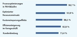 Als Innovationstreiber werden vor allem Geschäftsführung (26 %) und Ideenmanagement – das heißt alle Mitarbeiter – (25 %) gesehen. Wenig Innovationskraft geht laut den Befragten von Marketing (8 %) und externen Dienstleistern (7 %) aus. 64 % der Eigentümervertreter legen bei der Vergabe von FM-Dienstleistung großen Wert auf einen innovativen Ansatz des Dienstleisters, 26 % sind bereit, das Budget für innovative Lösungsansätze zu erhöhen. Bei der Frage nach den Mehrwerten von innovativem Facility Management erhoffen sich 97 % der Unternehmensvertreter Prozessoptimierungen und optimierten Ressourceneinsatz (94 %). 88 % erwarten Kosteneinsparungen und 83 % gehen von einer Effizienzsteigerung im Kerngeschäft aus. Kundenbindung betrachten 73 % als potentiellen Mehrwert.