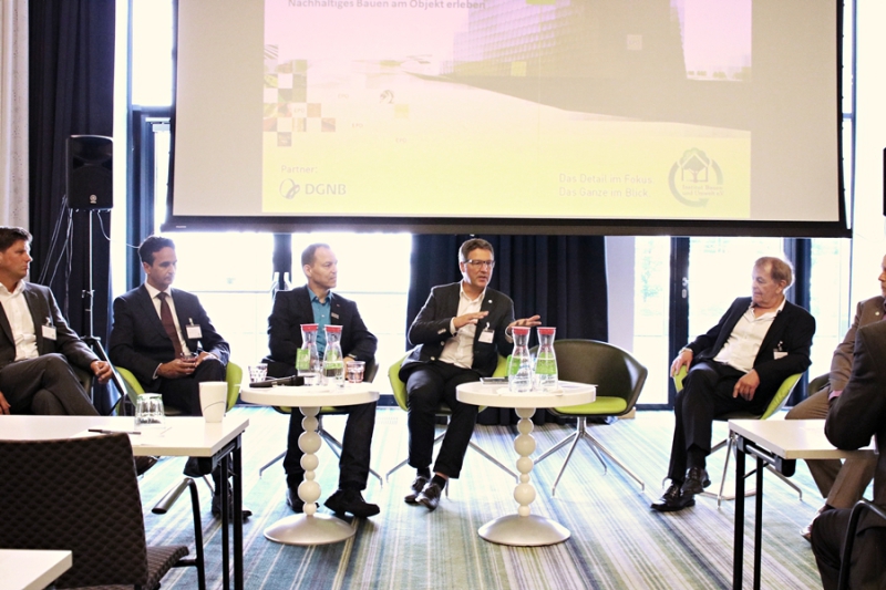 „Wir wollten unseren Mitgliedern - Unternehmen und Verbänden aller Arten von Bauprodukten und Baukomponenten die Möglichkeit bieten, ein zertifiziertes, nachhaltiges Gebäude zu erleben und bei der Gelegenheit direkt mit den für Planung, Bau und Betrieb Verantwortlichen in Kontakt zu treten“, begründet Burkhart Lehmann, Geschäftsführer des IBU, die Entscheidung für den Mitgliedertag im Scandic. Die wichtigsten Beteiligten des Projektes – Architekt, Auditor, Gebäudenutzer sowie ein Vertreter der DGNB wurden vom IBU als Experten eingeladen. Sie erläuterten die relevanten Prozesse und Entscheidungen und diskutierten anschließend gemeinsam mit den anwesenden Herstellern diverse Fragen und Problemstellungen. Kernthema der Veranstaltung waren Umwelt-Produktdeklarationen (en: Environmental Product Declarations – kurz: EPDs) und ihre Bedeutung für das nachhaltige Bauen – speziell als Datengrundlage für die Gebäudeplanung, -bewertung und -zertifizierung.