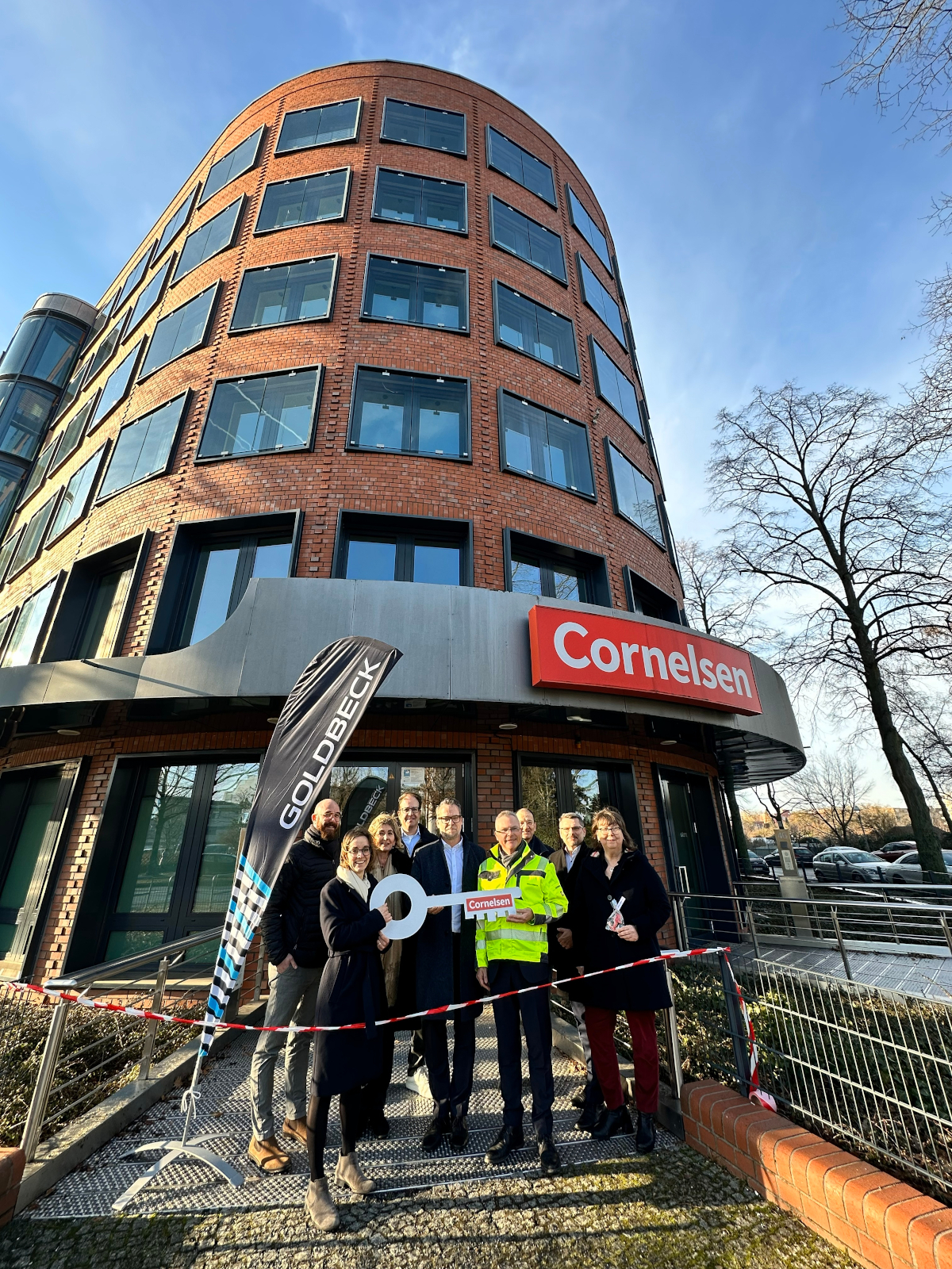Feierliche Schlüsselübergabe für das Verlagsgebäude: v.l. Sven Vogelfänger (Projektleiter Goldbeck) Andrea Cornelsen (Familie Cornelsen); Silvia Jakob (CFO Cornelsen Gruppe), Mark van Mierle (CEO Cornelsen Gruppe), Volker Huber (Geschäftsführer Goldbeck), Dietmar Rekow (Niederlassungsleiter Goldbeck), Dr. Ulrich Vest (Vorsitzender des Verwaltungsrats der Cornelsen Gruppe), Wjatcheslaw Herbin (Projektleiter New Space Cornelsen Verlag), Claudia Seidel (Betriebsratsvorsitzende Cornelsen Verlag.