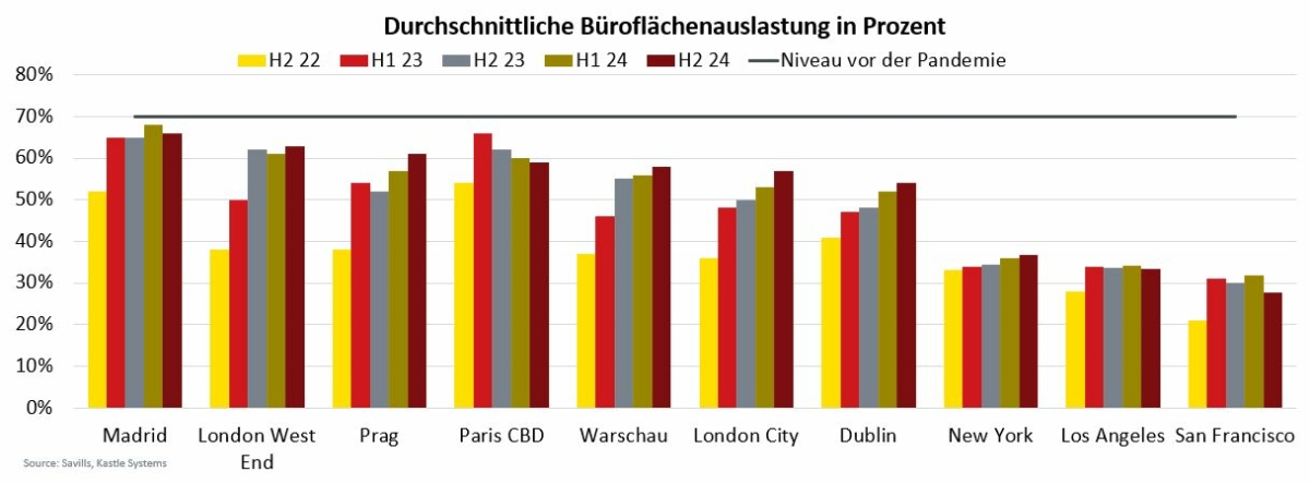 26.11.2024Laut Savills ist die durchschnittliche Büroflächenauslastung in Europa in den letzten sechs Monaten leicht von 59 % auf 60 % gestiegen. Vor der Pandemie lag der Durchschnitt bei 70 %.